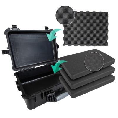 Innen ist die Fatbox mit einer individuell einteilbaren rechteckigen Schaumstoffeinlage und einer Noppenschaumstoffeinlage im Deckel ausgestattet. Den Innenraum können Sie nach eigenen Bedürfnissen anpassen. Hierzu wurde die Schaumstoffeinlage der Fatbox würfelförmig vorgeschnitten. Für Ihre selbst gestalteten Fächer trennen Sie einfach diese Einlageteile heraus, die Sie als Fach nutzen möchten. Die untere Schaumstoffeinlage schützt Ihre wertvolle Ausrüstung. So bekommen Sie die optimalen Polsterungsplätze für Ihre DSLR plus Zubehör, Elektrorollen, als GoPro Kamerakoffer oder was auch immer Sie gerne schützen möchten. Robuste, zweistufig funktionierende und versenkte Verschlussriegel sichern den Deckel der Fatbox.Eine versenkte Silikondichtung macht diese Box zu 100% Wasser-, Luft-, und Staubdicht. Wenn Sie die Box mit ins Flugzeug nehmen möchten und/oder unterschiedlichen klimatischen Bedingungen unterworfen sind, bietet die Fatbox ein Ventil zum Druckausgleich. Diese Zufuhr ist mit einer Rändelschraube mit Dichtung versehen. Diese Dichtung ist Wasserdicht und Druckunterschiede werden hierdurch ausgeglichen. Alle Schaniere sind mit extra dicken Edelstahlstiften versehen um höchste Robustheit zu gewähren. Diese finden sich am Tragegriff wieder, der anklappbar ist.