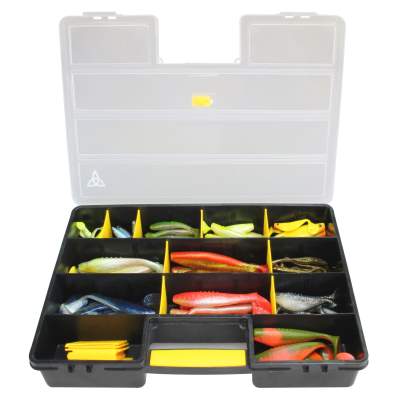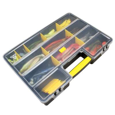 Die zum Lieferumfang gehörende Mega Köder- und Zubehörbox mit den Abmessungen 450x325x80mm ist in 4 horizontale Fächer aufgeteilt, die nach eigenen Wünschen mit den mitgelieferten Fachtrennern nochmal sebst unterteilt werden können.