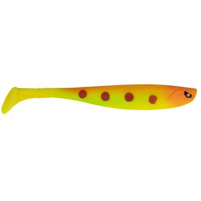 Der große Tellerschwanz hält den Köder jederzeit in der Spur, während er versucht mit schnellen Belly Flash (flankenden Bauch) auszubrechen und so für einen willkürlichen Lauf sorgt, de gerade bei kurzen Spinnstopps oder beim Ankurbeln mit heftigen Takes quittiert wird.